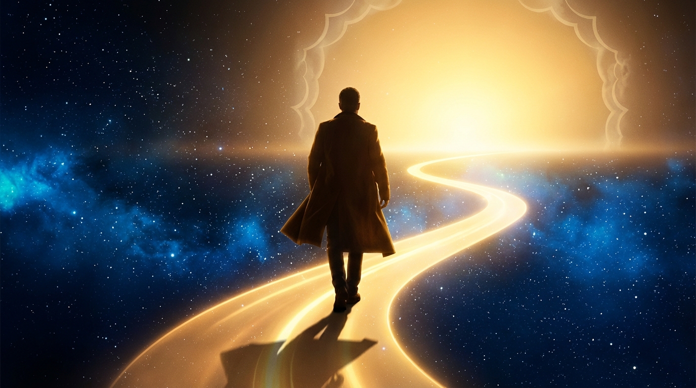 빛나는 길을 따라 확신 있게 걸어가는 모습