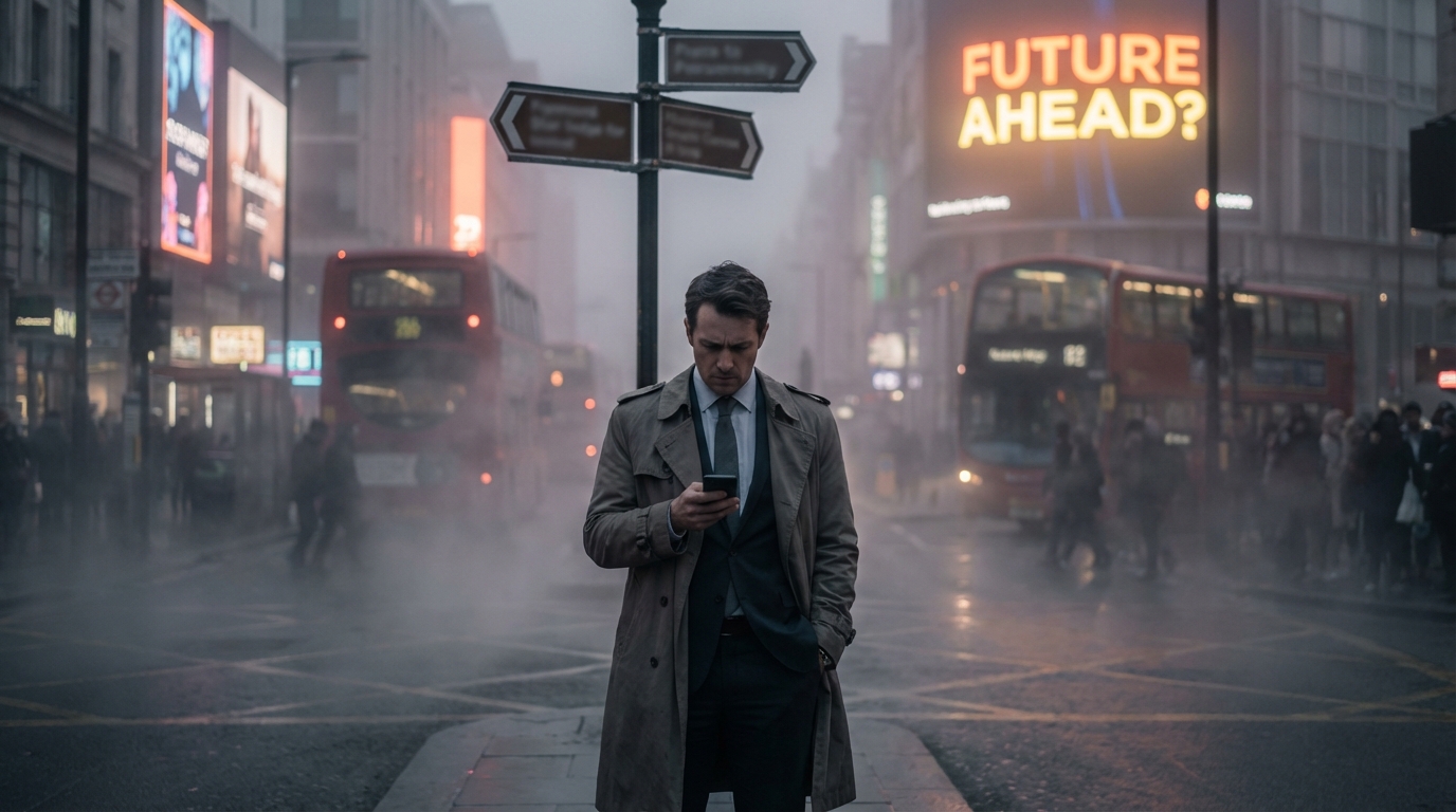도심 속 갈림길에서 방향을 찾지 못한 현대인의 모습
